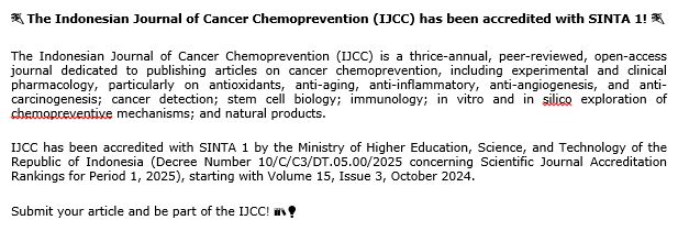 Indonesian Journal of Cancer Chemoprevention (IJCC) is an open access, peer-reviewed, triannual journal devoted to publishing articles on Cancer Chemoprevention including Experimental and Clinical Pharmacology, especially concerning Anti-Oxidants, Anti-Aging, Anti-Inflammation, Anti-Angiogenesis, and Anti-Carcinogenesis; Cancer Detection; Stem Cell Biology; Immunology; in vitro and in silico Exploration of Chemopreventive Mechanism; and Natural Products.